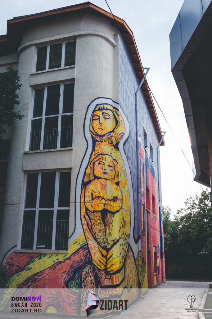 „Stickerele reprezintă pentru mine felul în care noi, oamenii, interacționăm între noi, indiferent că ne cunoaștem de o viață sau doar ce am făcut cunoștință. Stickerul este o bucată de hârtie, un desen care modifică realitatea spațiului în care este lipit, iar interacțiunea dintre doi oameni schimbă realitatea fiecăruia. Suntem stickere în viața celor din jurul nostru. Lucrarea propusă pentru ediția din acest an reprezintă un sticker imens (semnătura mea artistică) care acoperă pereții liceului unde am studiat, unde am fost profesor. Stickerul respectiv conține, oarecum codat, numele celui care a fost marele sculptor: APOSTU. Este un omagiu adus celui a cărui nume se regăsește în titulatura liceului. Litera “A” este o COMPOZIȚIE a artistului, litera “T” este redată folosind lucrarea “Tată cu fiu”, iar lucrarea mare, care poate fi “citită” mai ușor, este o reprezantare a lucrării “Mamă cu fetiță”. Felul în care am ales să caligrafiez numele artistului pe perete ne duce în situația în care avem pe unul dintre pereți cuvântul TU. Acesta poate fi considerat un îndemn pentru toți cei care calcă pragul acestei instituții. TU ești cel invitat să faci lucruri mărețe! Ai în fața ta exemplele celor care și-au dedicat viața artei, munca lor continuă pentru realizarea unor opere pe care TU le apreciezi. Temele alese (mamă cu fetiță/tată cu fiu), stickerul “postat” peste un fundal plin de caligrafia anului care ne-a surprins pe toți (2020, 2020, 2020…ne poate duce cu gândul la un 001000100111 – cod binar, care reprezintă evenimentele petrecute) reprezintă răspunsul meu asupra timpurilor pe care le trăim: familia, arta, sunt elemente (nu singurele, dar importante pentru individ cât și pentru societatea din care face parte) care asigură liniștea atunci când viața te pune în fața unor evenimente nedorite, pe care nu le poți controla. Arta, dragostea (indiferent că este maternă, paternă, de orice fel) sunt elemente care acoperă partea urâtă a 2020-ului pe care îl trăim.”